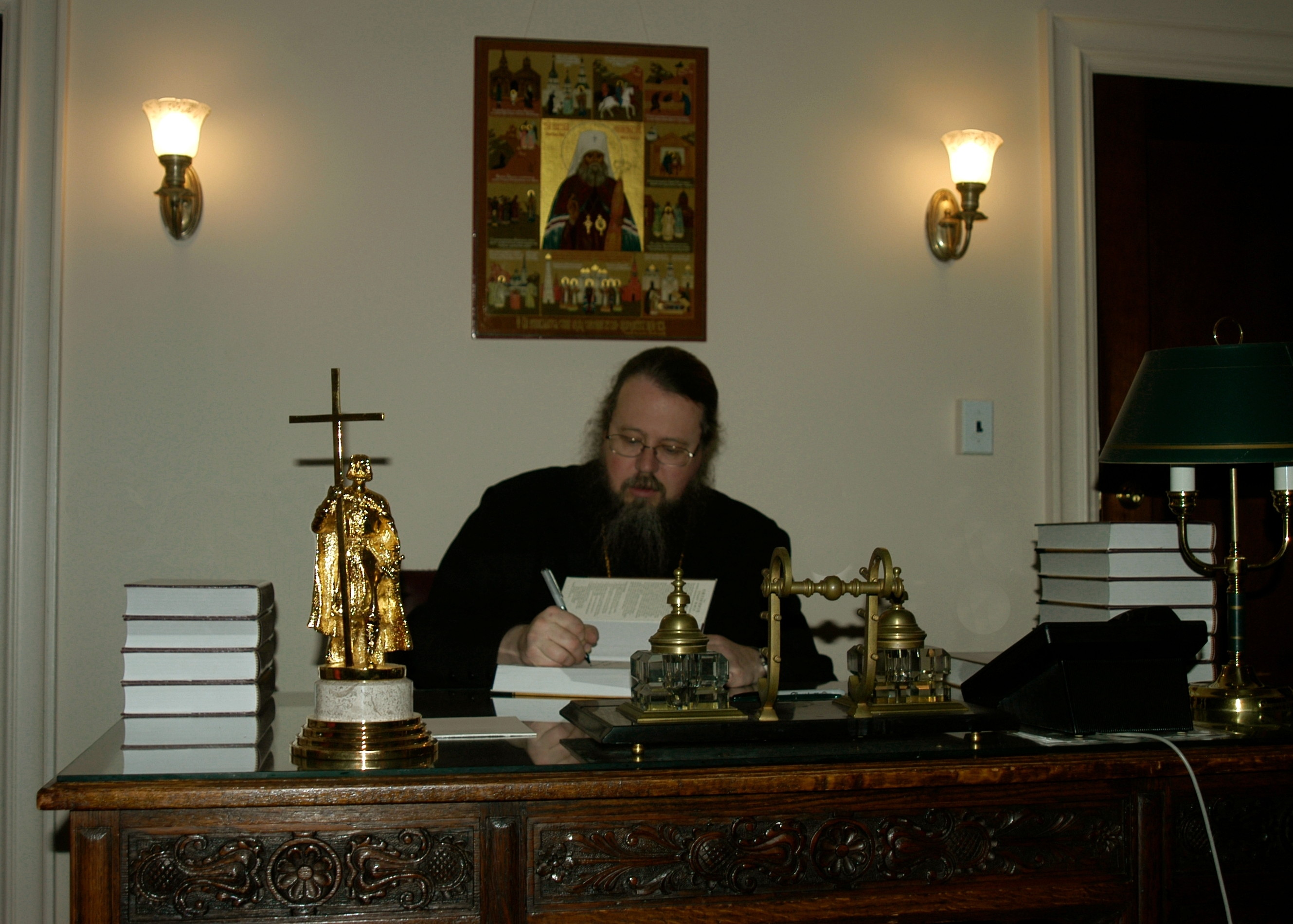 Metropolitan Jonah writes a greeting in Orthodox Study Bibles before they are shipped to Russia.