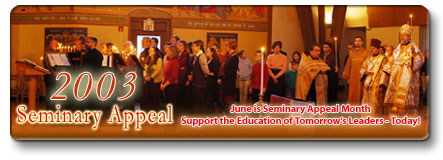 Your generous support of the Orthodox Church in America’s 2003 Seminary Appeal will help to ensure that our seminaries will be able to continue their mission the same mission shared by the entire Church as it strives to bring the fullness of the Gospel to every corner of this vast continent. The generosity you display today will not only ensure that our seminaries will be able to meet their present needs and maintain their current programs, but will help in strengthening and expanding their mission to equip those who have a burning desire to fulfill God’s great commission now and in the future.