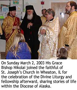 With the blessing of His Grace, Bishop Job of Chicago, Saint Joseph Church here hosted His Grace, Bishop Nikolai of Sitka, Anchorage and Alaska on Meat Fare weekend, March 1-2, 2003. His visit coincided with the parish’s 14th Anniversary.