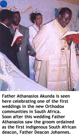 Fr. Athanasios Akunda, the Orthodox Christian Mission Center (OCMC) Fall 2003 Lecture tour speaker and mission priest in South Africa, has been successfully making known the growth of the Orthodox Church in South Africa in Orthodox communities in New England, Pennsylvania and New York. He is fully supported by OCMC’s Support A Mission Priest (SAMP) program and is one of the first SAMP mission priests to serve as a missionary outside of his own country.