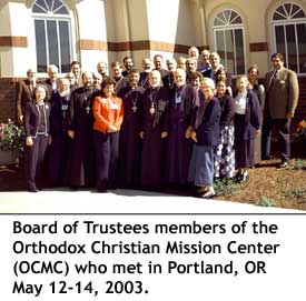 The Orthodox Christian Mission Center (OCMC), with headquarters in St. Augustine, FL recently held their Board of Trustees meeting here from May 12-14, 2003. Thirty people committed to seeing the Gospel brought to all nations, came together for the official international mission agency of the Standing Conference of Canonical Orthodox Bishops in America (SCOBA) with members representing jurisdictions within SCOBA.